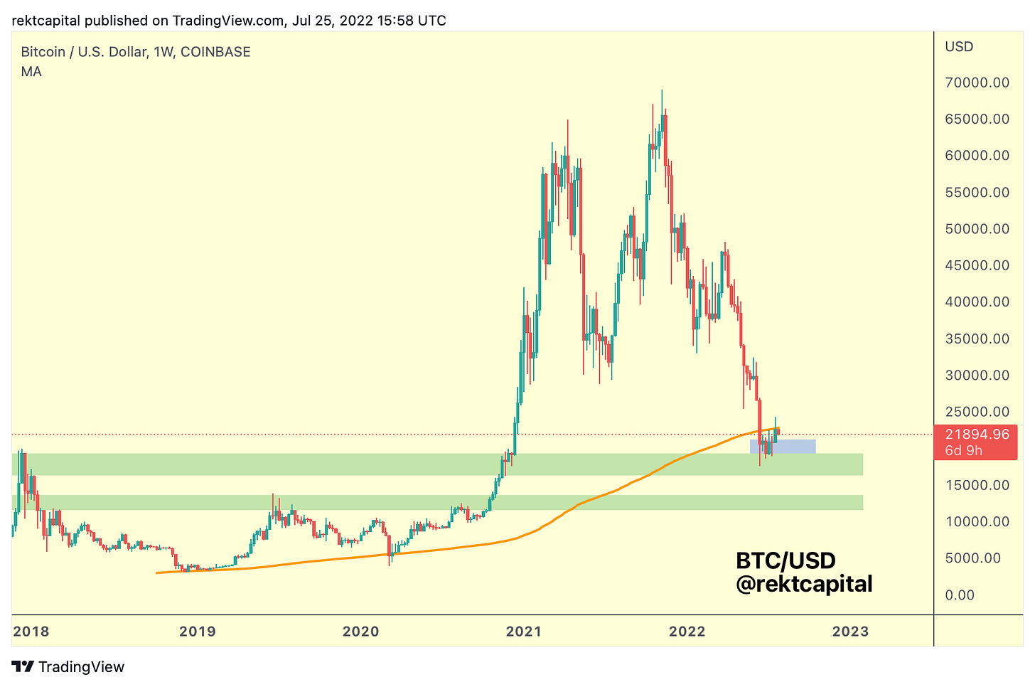 In his newsletter, Rekt says that Bitcoin will likely have some trouble cracking the $21,894 level, which currently sits right at the 200-week moving average, a level often thought of by traders as a crucial line of support or resistance.