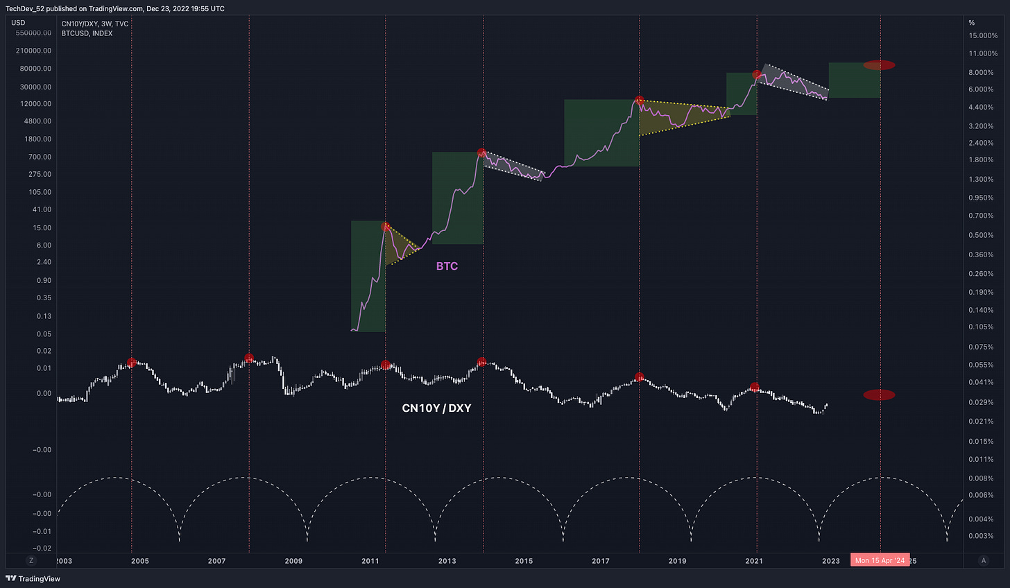 Each local top in CN10Y/DXY marked or led a major impulse top in Bitcoin, and each local upside reversal marked or led the start of a major Bitcoin impulse.”
