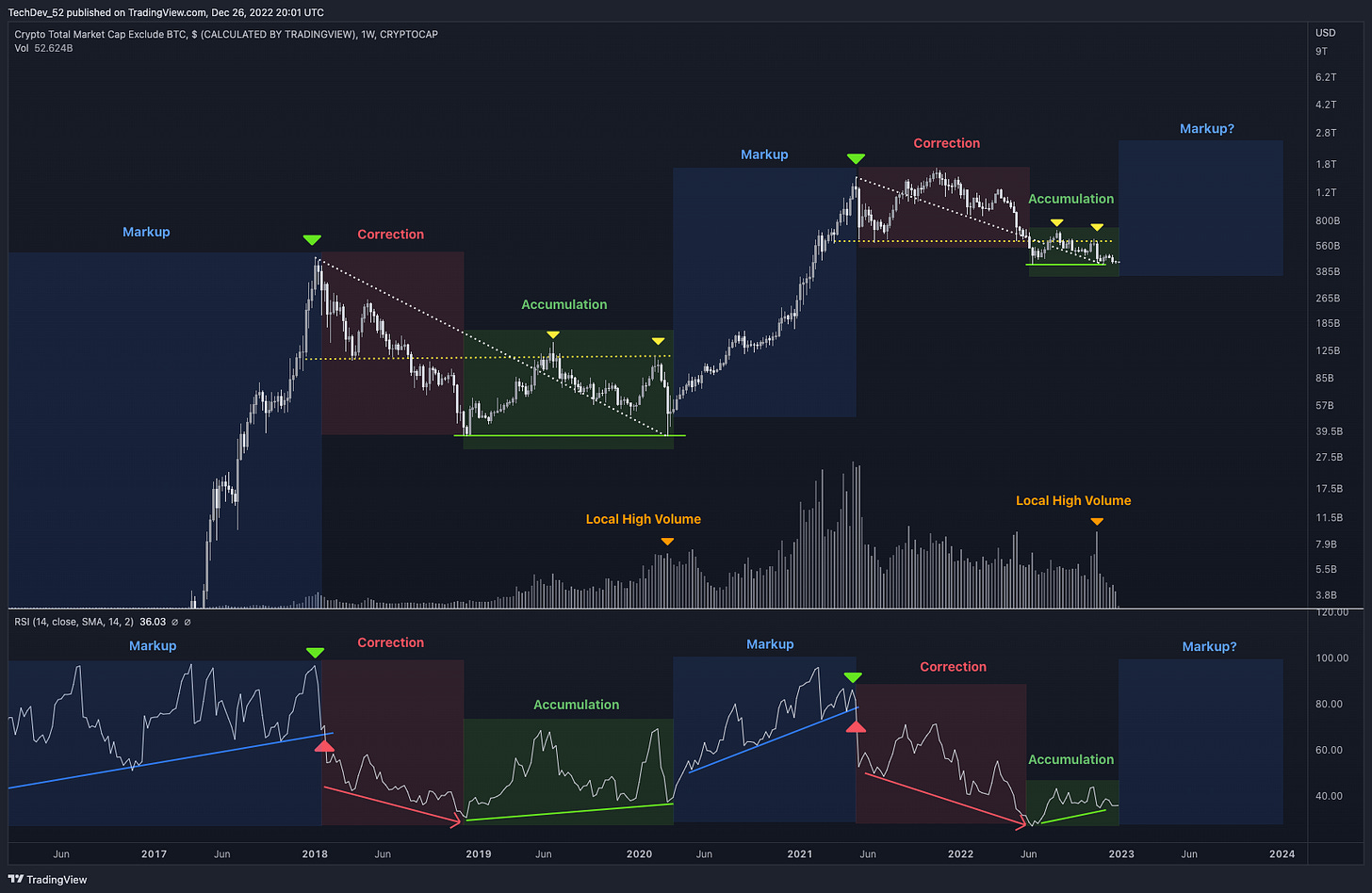 “We start with the altcoin market cap, where I view the market divided into a cyclical set of regions, Correction > Accumulation > Markup. The below chart should indicate why I believe we’re in accumulation, and that markup is expected next.