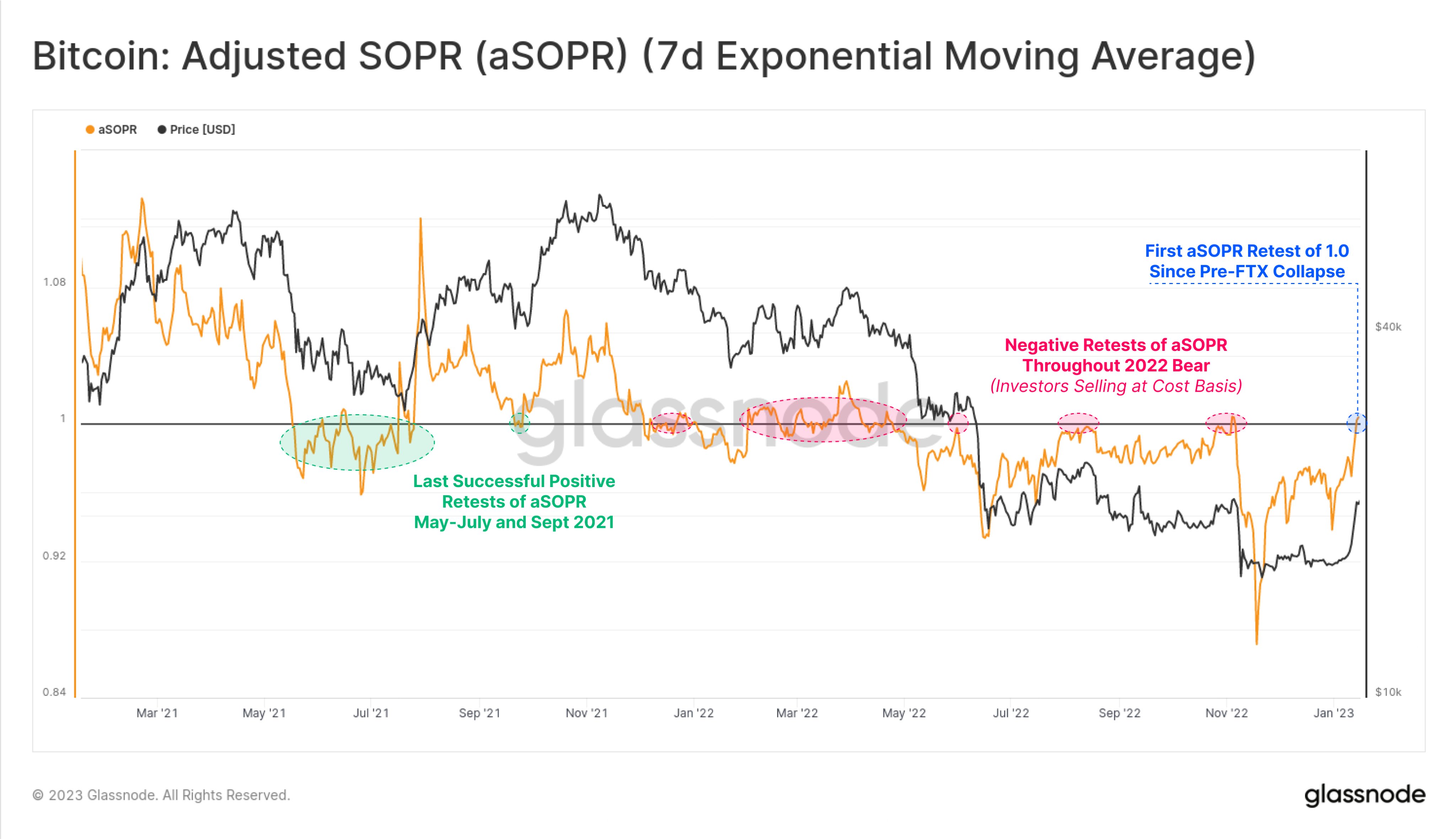 “A convincing break above 1.0 for realized [profit/loss] ratio, or aSOPR has historically signaled a cycle regime shift is underway. A successful retest and bounce of aSOPR from 1.0 is often observed near cycle turning points.”