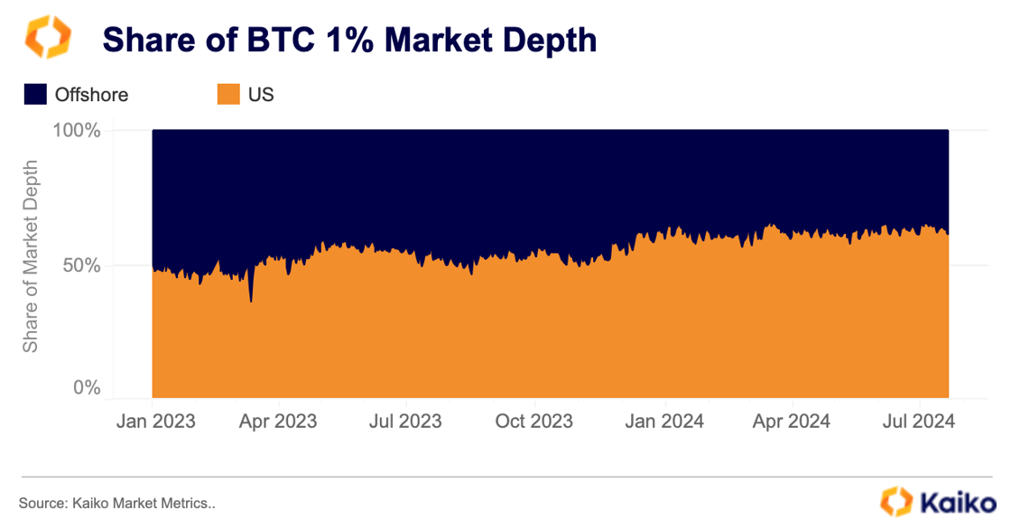 “The approval of spot BTC ETFs in the US this year has likely contributed to the increase, as more institutional firms participate in the market. US exchanges now account for over 60% of BTC’s 1% market depth, up from around 45% at the beginning of 2023.”