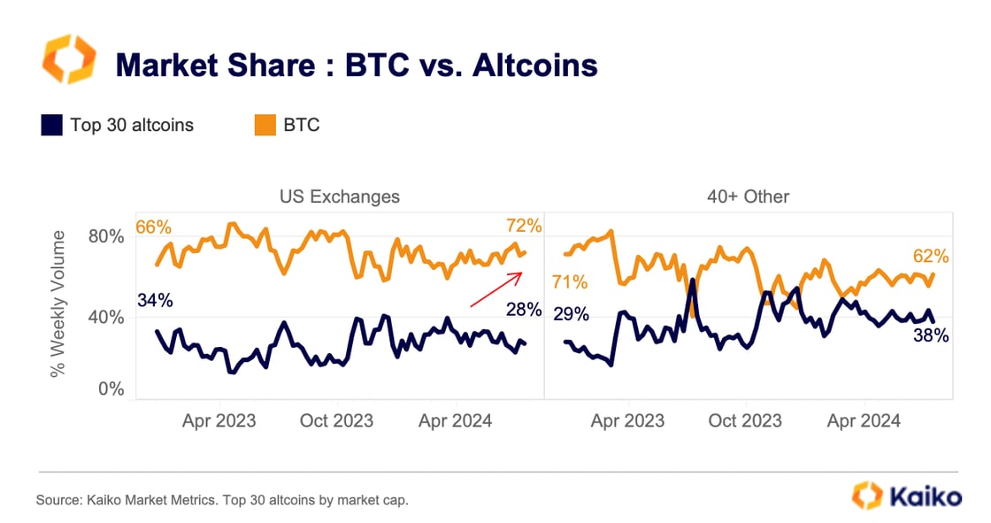 “Historically, BTC dominance has been higher on US platforms due to higher institutional participation in the US, with traders preferring BTC over riskier altcoins. Interestingly, despite BTC’s price decline in Q2, BTC’s share on US markets continued increasing, suggesting that the launch of spot ETFs could further exacerbate this trend.”
