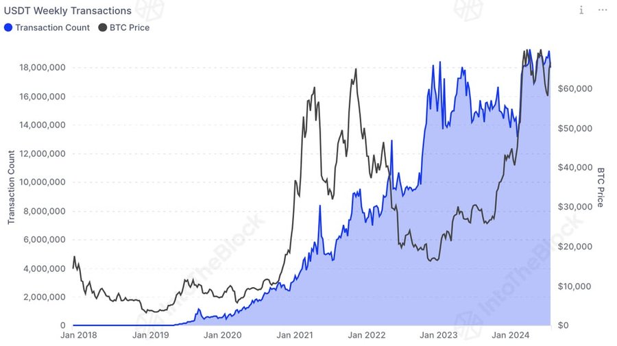 In a tweet, IntoTheBlock revealed that USDT has been breaking records all year, with over 18 million weekly transactions on EVM chains. Surprisingly, 78% of these transactions take place on the TRON DAO, cementing its position as the preferred transfer platform.
