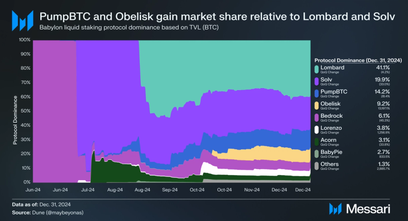 - By the end of 2024, Babylon’s top three Finality Providers by delegation amount were liquid staking protocols, accounting for 68.5% of total delegations. These protocols included Lombard, Solv, and PumpBTC.