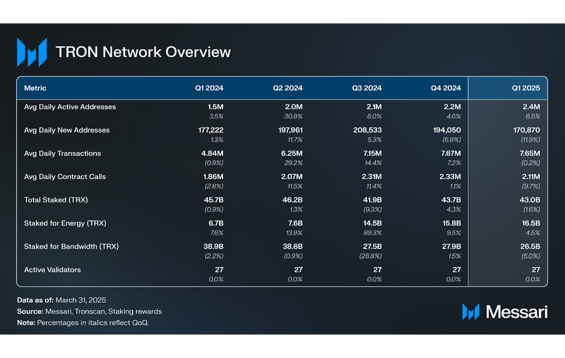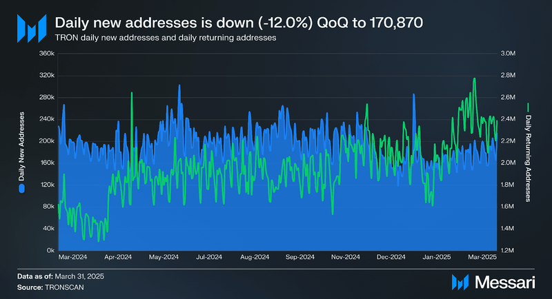 Q1 usage was mixed for TRON, with increases in some onchain activity metrics like daily active addresses and CeFi transactions, while others, like average daily new addresses and daily transactions, decreased. Average daily transactions decreased 0.2% QoQ from 7.7 million to 7.7 million, and daily active addresses grew 6.5% QoQ from 2.2 million to 2.4 million.