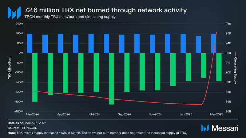 In Q1, the circulating supply of TRX increased from 86.6 billion to 95.0 billion. This is the first quarter where the circulating supply of TRX increased due to the migration of USDDOLD to USDD 2.0. The increase in TRX’s circulating supply is due to the deprecation of USDDOLD and the migration to USDD 2.0, which released previously locked TRX collateral back into circulation. While this change affects circulating supply, it does not increase TRX’s total supply and instead reflects a shift in accounting methodology.