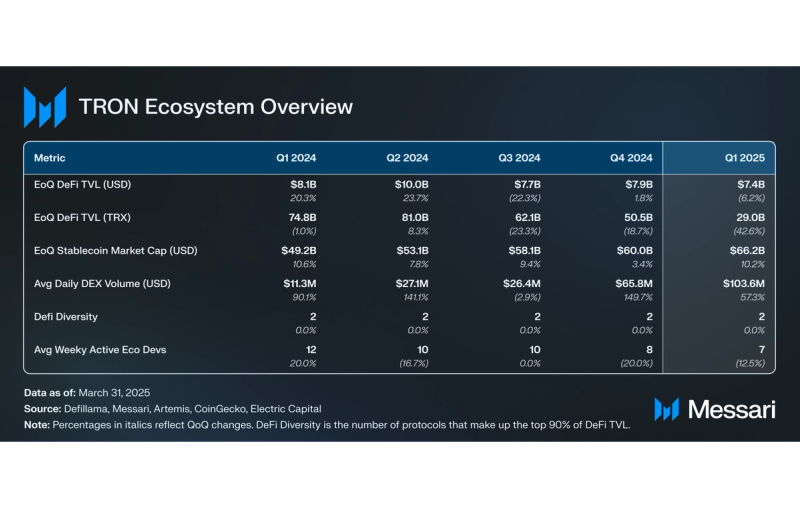 In Q1 2025, TRON maintained steady growth across key metrics, with continued increases in market cap, total revenue, and ecosystem engagement. Despite a temporary rise in TRX’s circulating supply, the network’s financials and user activity remained strong, bolstered by stablecoin dominance, DeFi participation, and improved infrastructure. Stablecoin activity remained a cornerstone of TRON’s ecosystem, with USDT accounting for 99.3% of stablecoin supply and average daily USDT transfer volumes up 3.3% QoQ to $19 billion. TRON further expanded its ecosystem through strategic partnerships with T3 FCU, Wintermute, Eternal AI, Kiln, Nansen, Tap Protocol, Pentagons Games XP, and the launch of USDD 2.0.