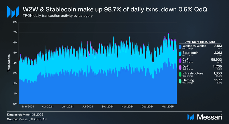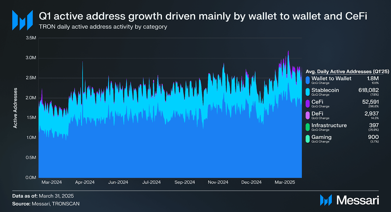 Wallet transfers and stablecoins have historically dominated average daily active address activity on TRON. Q1 was no different, as an average of 1.8 million addresses conducted a daily wallet transfer, up 10.1% QoQ. Stablecoin transactions saw a decrease of 7.8% QoQ to 618,081, which aligns with the decrease in overall stablecoin transactions. Active addresses interacting with CeFi increased by 296.8% QoQ to 52,591, while Infrastructure interactions decreased by 25.9% QoQ to 397, almost erasing the strong growth in Q4.