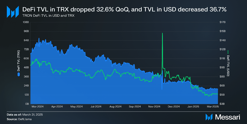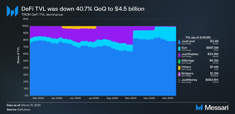 DeFi TVL on TRON denominated in TRX fell 32.6% QoQ from 29 billion to 19.5 billion. The TVL denominated in USD also decreased, following TRX’s price, down 36.7% QoQ from $7.4 billion to $4.7 billion. Compared to other networks, TRON dropped from third to fifth-highest network by TVL at $4.9 billion, getting beat by third-place Bitcoin ($5.3 billion) and fourth-place BNB Smart Chain ($5.8 billion). Notably, the large spike in DeFi TVL in terms of USD in Q4’24 was due to a sudden rise in TRX’s price and subsequent drop in Q1’25.