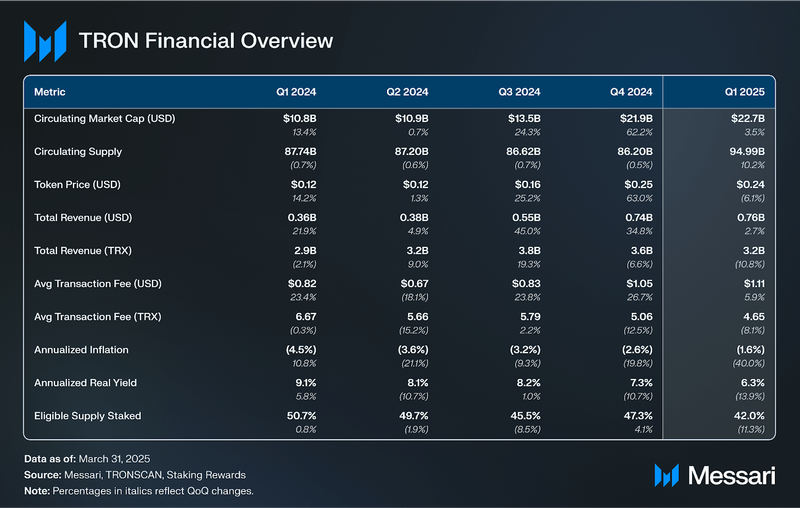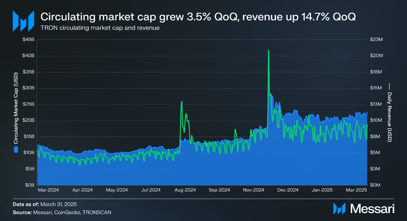 - TRON experienced positive growth across many key metrics in Q1, including a 3.5% QoQ increase in market cap, reaching $22.7 billion, and a 2.7% QoQ increase in revenue to $760.2 million, an all-time high for the network.