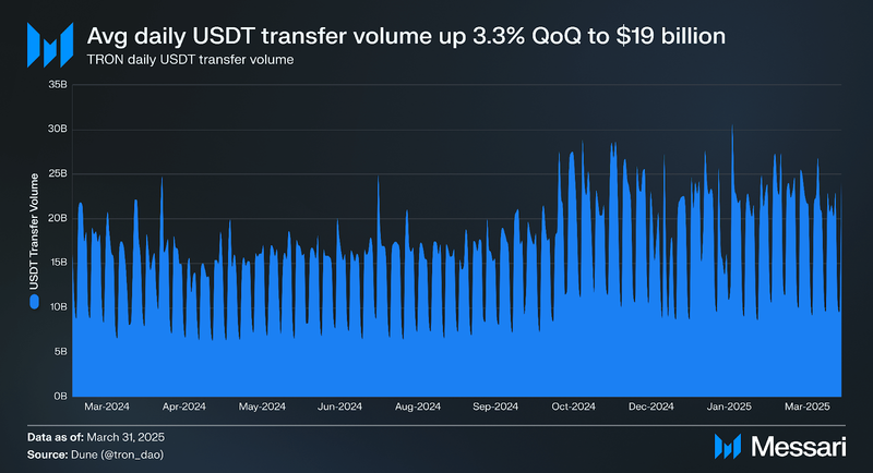 - Stablecoin usage remained strong, with USDT on TRON representing 99.3% of the total stablecoin market cap, or $65.7 billion (+13.9% QoQ). The average daily USDT transfer volume increased by 3.3% QoQ, reaching $19 billion.