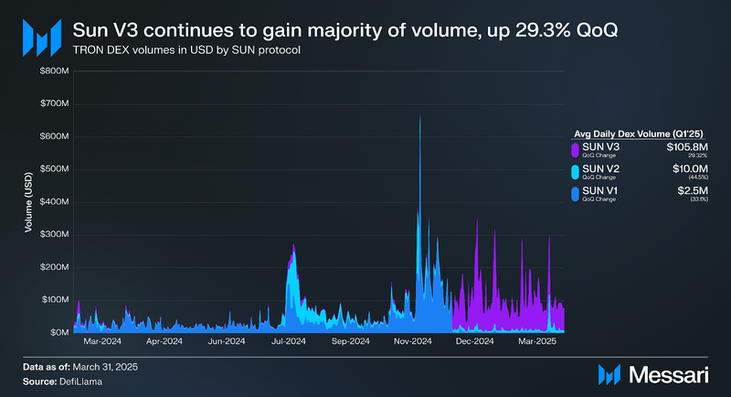 Overall DEX activity on TRON normalized in Q1, with average daily DEX volumes increasing 29.3% QoQ. Zooming in on SunPump, its slowdown is most evident through the decrease in volume routed through SUN V2, which hosts liquidity pools for bonded memecoins from SunPump. The average daily DEX volume on SUN V2 was down 44.4% QoQ.