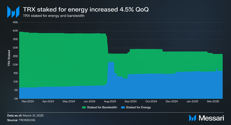 Notably, the amount staked for bandwidth is down 5% QoQ from 27.9 billion to 26.5 billion. As for energy, staking increased 4.5% QoQ from 15.8 billion to 16.6 billion, in part due to overall higher gas fees. The amount staked for each resource is correlated with consumption.