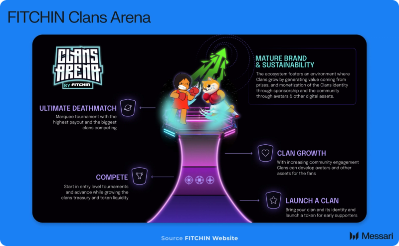FITCHIN’s ecosystem is centered around the upcoming Clans Arena. Clans Arena is a tokenized entertainment ecosystem enabling gaming communities (Clans) to create their own token and compete for prize pools that enhance its liquidity. The Clans Arena is supported by a broader ecosystem, which includes: