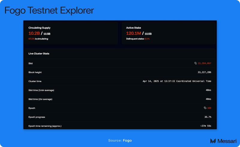 Alongside testnet, Fogo released a testnet explorer on April 11, 2025. It displays real-time validator performance, slot times, and throughput metrics, allowing early participants to monitor block production and network responsiveness.