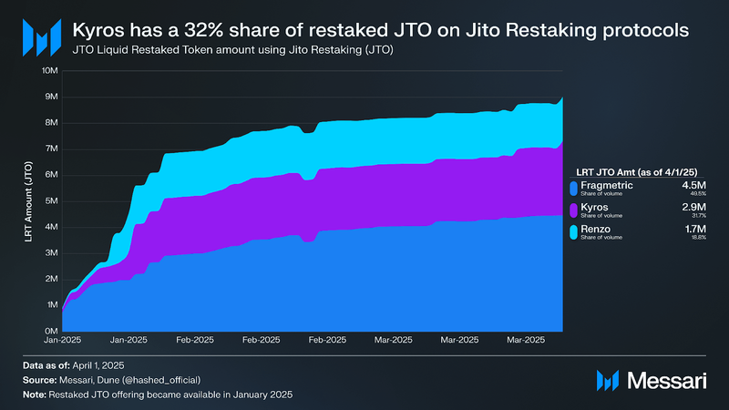 Kyros holds a 32% market share of restaked JTO among restaking protocols utilizing Jito’s restaking infrastructure. Out of 9 million liquid restaked JTO across these protocols, Kyros has 2.9 million in its kyJTO vault.