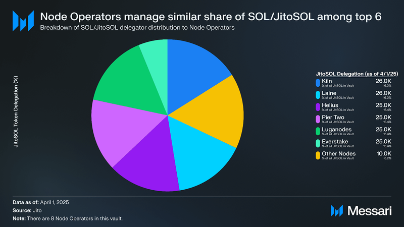 The NOs with the highest allocations of the underlying assets in the kySOL vault are Kiln and Laine, with 26,000 JitoSOL (16% of 162,000 JitoSOL) allocated each. The next four highest NOs by JitoSOL allocation are Helius, Pier Two, Luganodes, and Everstake.