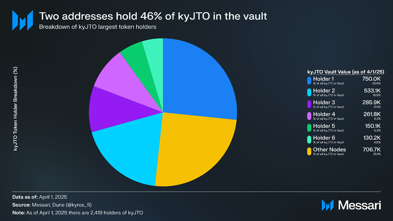 As of April 1, there are 2,400 holders of kyJTO onchain, with the two top holder addresses holding 46% (1.3 million kyJTO) of the total assets. SwissBorg also operates a kyJTO wallet and, according to its internal database, has 300 holders.