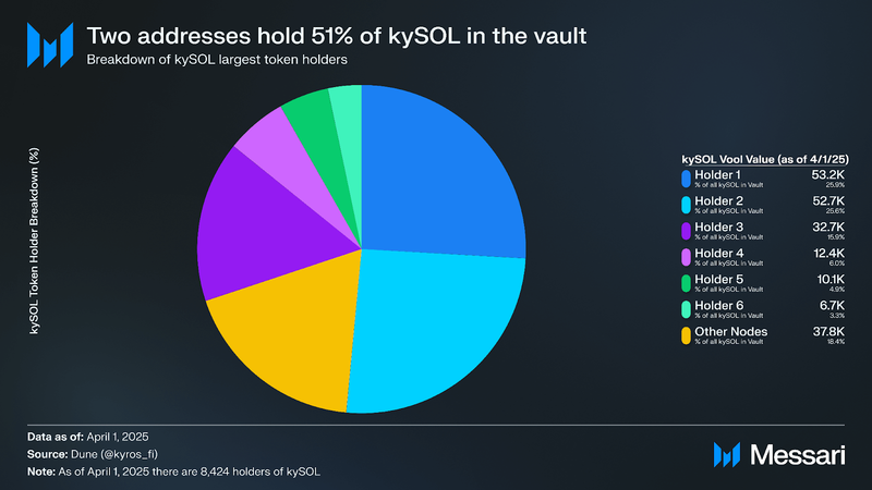 As of April 1, there are 8,400 holders of kySOL onchain, with the two top holder addresses holding 51% (105,900 kySOL) of the total assets. SwissBorg, a CeFi asset manager, operates the top holder address and, according to its internal database, has 3,900 holders of kySOL.