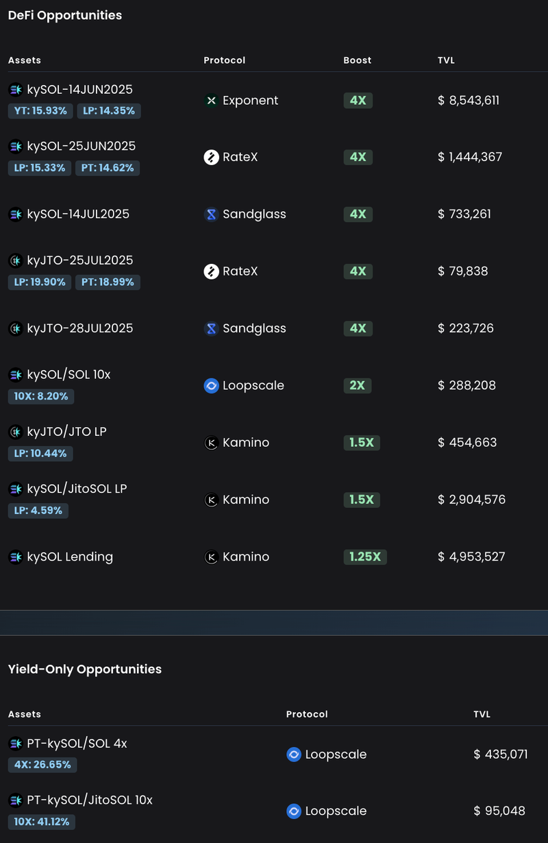 - kySOL is integrated across several Solana-based DeFi platforms, including Kamino, Exponent, Sandglass, and RateX, enabling lending, liquidity provision, and yield trading.