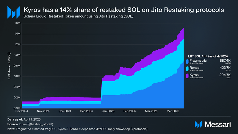 - As of April 1, Kyros has $36.3 million in TVL across its vaults, 84% of which is kySOL and 16% kyJTO. Combined, there are 15,000 holders of these tokens, 10,800 onchain holders and 4,200 via SwissBorg, a CeFi asset manager.
