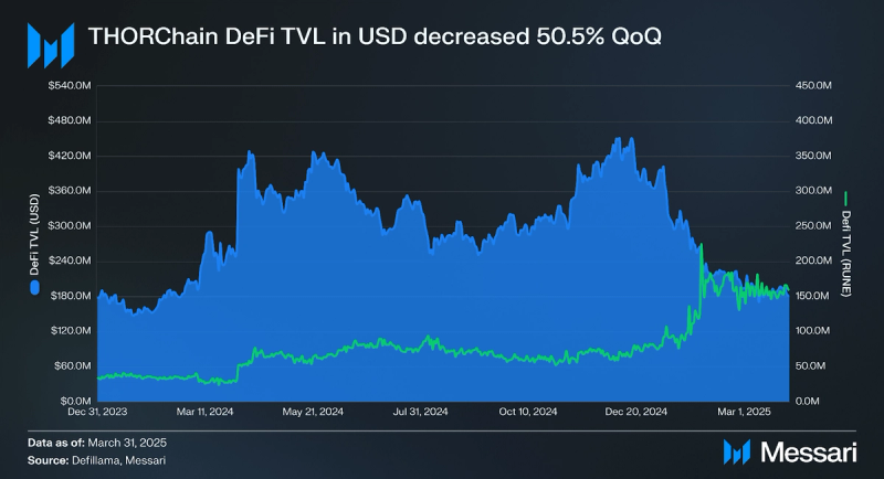 THORChain DeFi Total Value Locked (TVL) declined sharply in Q1 2025, finishing the quarter at $181.1 million, down 50.5% from $368.6 million in Q4. The drop in USD-denominated TVL was largely driven by RUNE’s 74.5% price correction, which significantly impacted the value of pooled assets. TVL peaked early in the quarter at $367.7 million on January 2 before trending downward in parallel with RUNE’s market performance.