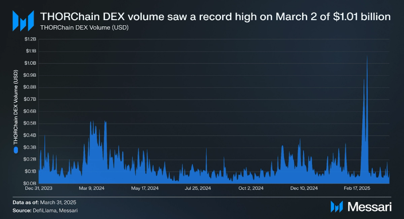 Despite the lower average volume, Q1 included a record spike in throughput driven by abnormal activity following the Bybit exploit. On March 2, THORChain processed a single-day high of $1.05 billion in swaps as hackers used the protocol to convert stolen ETH into BTC. This surge distorted weekly metrics but did not offset the overall downtrend in organic swap usage.