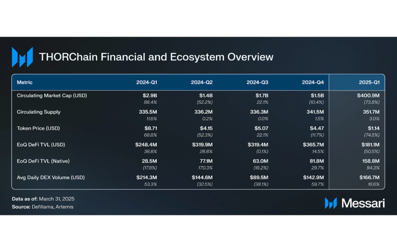 Following a volatile close to 2024, THORChain’s native asset, RUNE, saw a sharp correction in Q1 2025. RUNE ended the quarter at $1.14, down 74.5% quarter-over-quarter (QoQ), underperforming both BTC and ETH, which posted more stable price action declining 12.6% and 45.5% respectively. The token’s market capitalization declined 73.8% QoQ, falling from $1.5 billion to $400.9 million—its lowest point since mid-2022. THORChain’s rank among digital assets dropped accordingly from 69th to 119th, reflecting weakened sentiment and broader de-risking across the altcoin market.