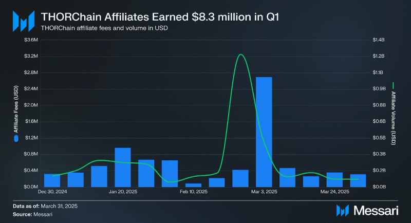 THORChain affiliate revenue dropped from a total of $11.4 million in Q4 to $7.9 million in Q1, a 37.3% decrease. On average, affiliates earned a combined $87,940 per day throughout Q1, with a peak of $492,533 on Feb. 27, 2025, partly in response to the Bybit exploit.