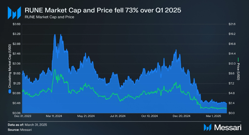 - RUNE fell 74.5% QoQ, dropping from $4.48 to $1.14, significantly underperforming BTC and ETH over the same period.