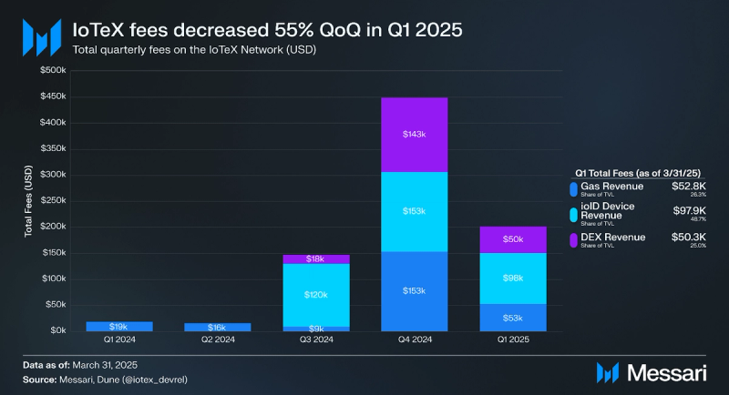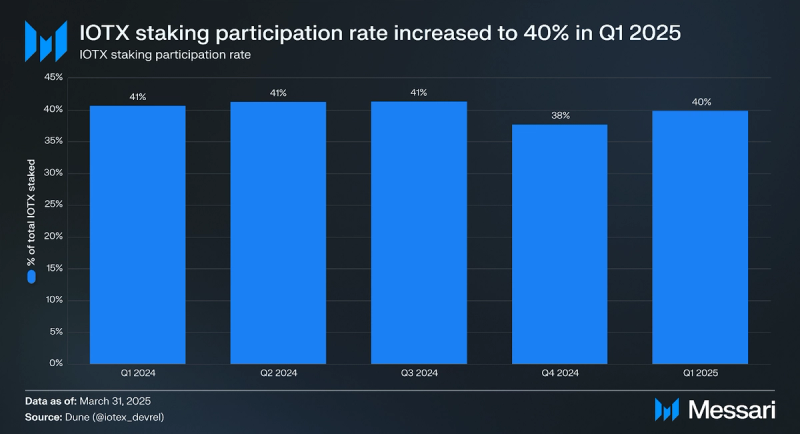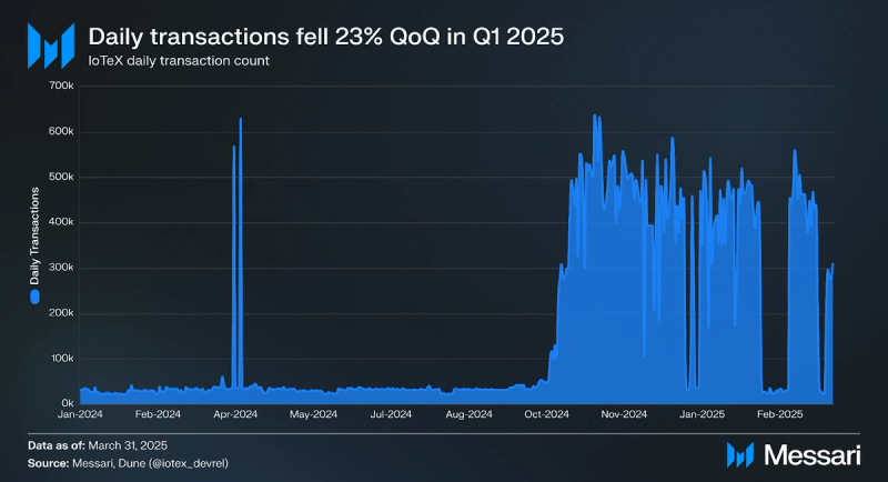 Despite the QoQ decline in activity, the IoTeX team continues to innovate. In Q1, IoTeX expanded its DePIN infrastructure suite with the launch of Quicksilver, a framework that enables AI agents to collect and act on decentralized physical data. Dual‑mining rewards for ioID‑equipped devices went live through two partnerships. On Jan. 24, GEODNET’s GEO‑PULSE device became the first live integration of ioID and ZK proofs for end‑to‑end verifiable data. Then on Mar. 18, Nubila’s Marco weather station program introduced a five‑phase reward structure issuing IOTX for staked device data. IoTeX will pursue similar collaborations and integrations in the coming quarters as it continues to emphasize verifiability as a catalyst for DePIN demand.