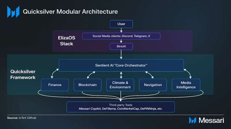 IoTeX has existing Quicksilver integrations with third-party tools, including Messari Copilot, DePIN Ninja, DefiLlama, Nubila, and CoinMarketCap, with plans to add more. The protocol also intends to develop a coordinated network (swarm) of specialized agents orchestrated by Quicksilver, each with distinct roles and capabilities, to solve complex problems and respond to user queries. The swarm will integrate existing and future tools, such as BinoAI, Nubila, and other DePIN-focused applications, to answer DePIN-related user queries.