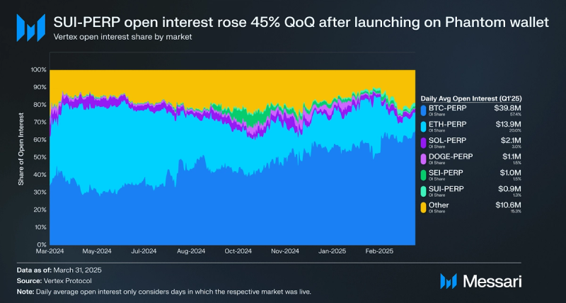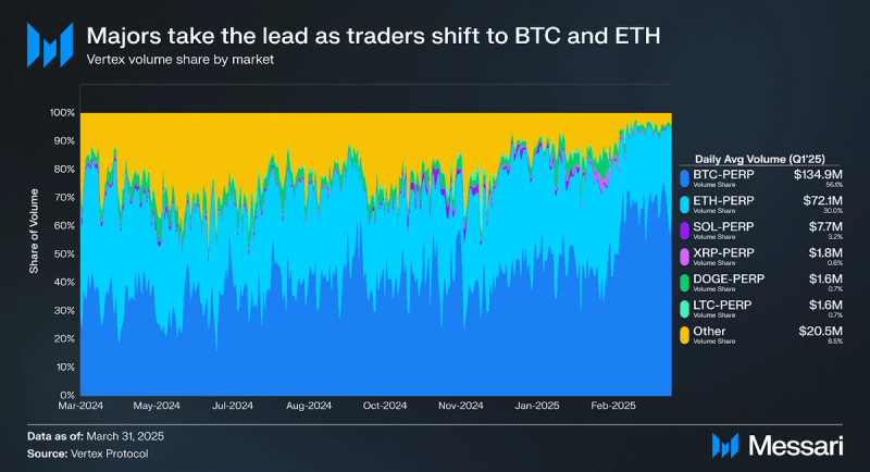 BTC-PERP remained the clear anchor of trading activity on Vertex in Q1. Its daily average volume rose 6.9% QoQ to $134.9 million, increasing its share of total protocol volume to 56%, up from 42% in Q4. This growth came despite a broader market cooldown, suggesting traders leaned more heavily into BTC markets as a relatively stable venue.