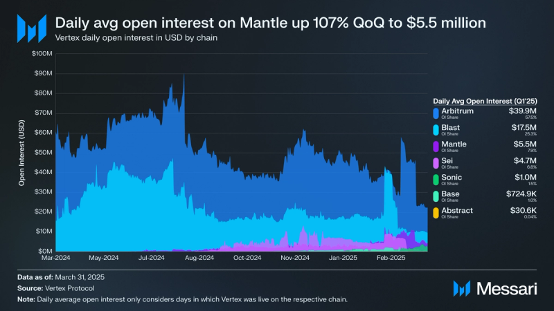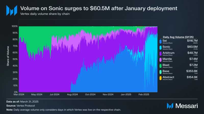In Q1, Vertex had $241.1 million in average daily volume across chain deployments, a QoQ decrease of 19%. Broken down by deployment, across the chain deployments on Vertex, Sei remained the highest-volume chain for the second consecutive quarter with $116.7 million daily average volume. Sei held its lead after overtaking Arbitrum with $149 million in daily average volume in Q4 2024.