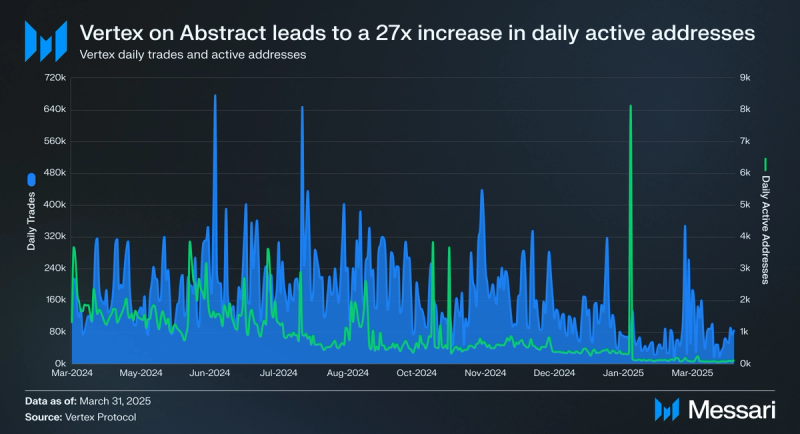 The sharp spike in active addresses in Q1 reflects the launch of Vertex on Abstract. That day, 91% of users transacted through Abstract, likely driven by its XP incentive program. Abstract XP is a points-based system that rewards users for onchain activity, including trading on Vertex. 91% of users were trading on Abstract that day.