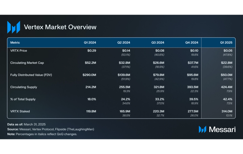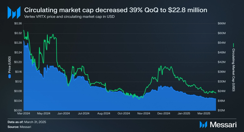 VRTX’s circulating market cap decreased 39% QoQ from $37.7 million to $22.8 million in Q1. VRTX’s market cap rank dropped from 751st to 821st amongst all tokens, indicating weaker relative performance within the broader market. The broader perp DEX sector underperformed: GMX declined 55%, and Hyperliquid fell 49%. Against that backdrop, VRTX’s trajectory was directionally in line with sector peers.