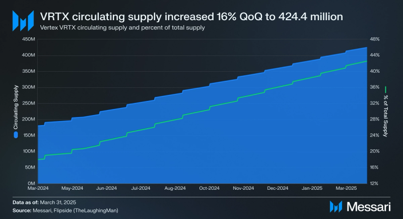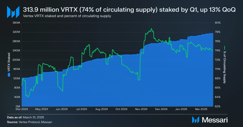 - VRTX staking climbed 13% QoQ to 313.9 million tokens, with 74% of the circulating supply staked, underscoring continued user commitment to the protocol.