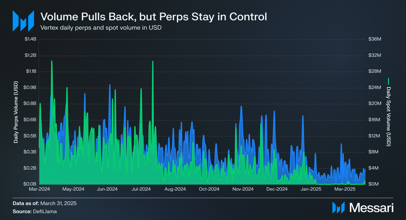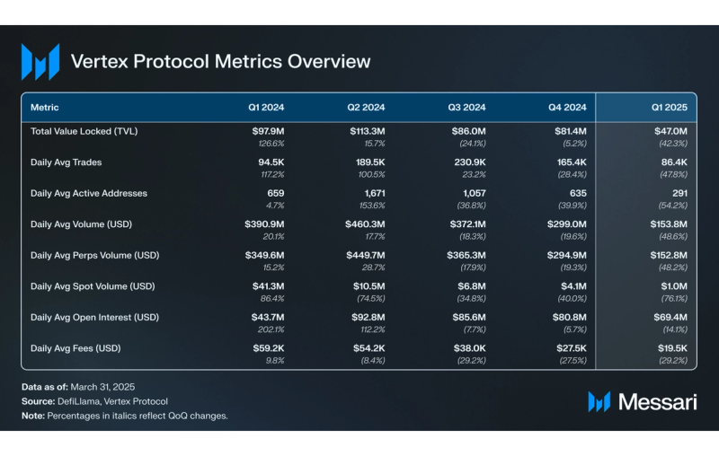 Vertex offers both perpetual and spot markets, though perpetuals dominate activity. Across both market types, Vertex averaged $241.1 million in daily volume during Q1 2025, a 19.3% decrease from Q4’s daily average volume of $299 million. Perpetual markets generated $152.7 million daily average volume, accounting for 99% of all trading activity. For the quarter, perpetual volume totaled $13.7 billion, representing approximately 1.4% of all onchain perpetual volume ($989.9 billion) in Q1. Vertex’s market share decreased from 3.7% in Q4, reflecting increased competition in the perpetual DEX market.