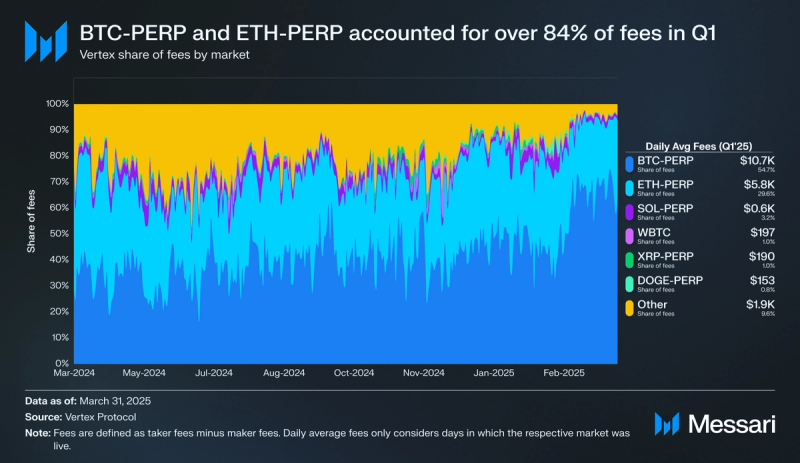 Q1 was a recalibration phase for Vertex following a high-growth 2024. Vertex continued to strengthen its multichain presence and protocol infrastructure. Sonic emerged as a standout deployment, quickly surpassing Arbitrum and Sei in fees and Arbitrum in volume. Meanwhile, BTC-PERP and ETH-PERP gained market share, reflecting user preference for high-liquidity majors in choppy markets.