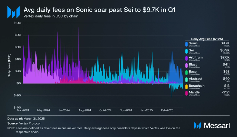 Sonic emerged as the leading fee-generating chain, accounting for 49% of all protocol revenue in its first full quarter. Daily average fees on Sonic reached $9,710—nearly half the protocol’s entire fee base. This outcome validates Vertex’s expansion approach: early-mover advantage on newer chains combined with well-targeted incentives can drive immediate returns.
