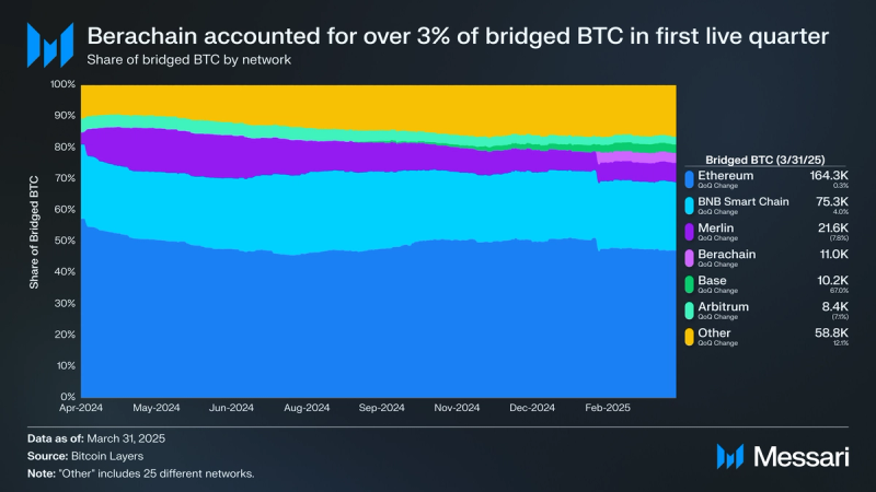 Berachain, an L1 that launched in Q1, quickly became one of the top networks by BTC bridged, ending the quarter with 11,000 BTC (4th most amongst all networks). Berachain’s Proof-of-Liqudity (PoL) mechanism has made its DeFi yields attractive, leading to a surge of bridged BTC. Another notable gainer was Base, which saw its bridged BTC increase 67% QoQ from 6,100 to 10,200. Coinbase’s cbBTC has made BTC more accessible to users on the network. Ethereum remained the network with the most bridged BTC, essentially flat QoQ at 164,300.
