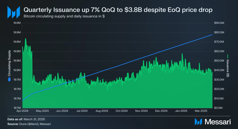 Bitcoin’s circulating supply increased by 0.2% QoQ from 19.80 million to 19.84 million in Q1. Until Bitcoin’s next halving in 2028, block rewards per mined block are 3.125 BTC. Total issuance in USD was up 7% QoQ from $3.56 billion to $3.81 billion, despite BTC finishing Q1 at a lower price than Q4. Taking a look at daily average issuance by month, issuance remained quite steady throughout the quarter, but ultimately trended downwards: