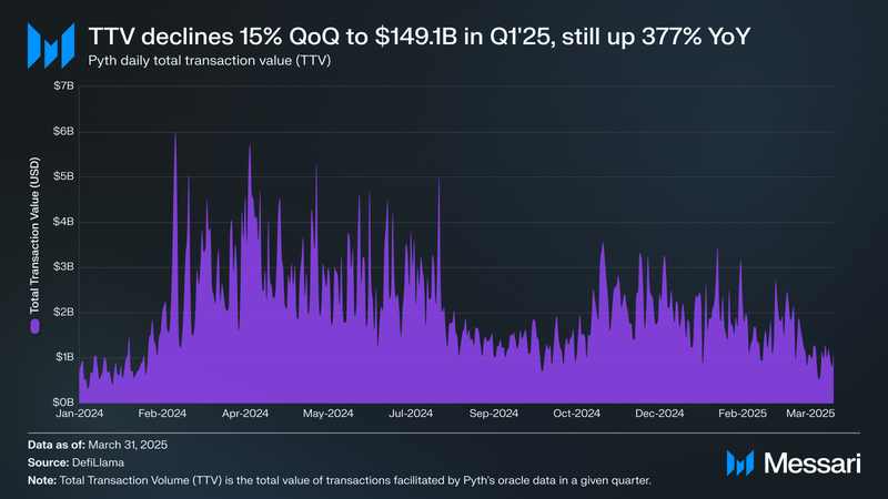 Total Transaction Value (TTV) for Q1’25 reached $149.1 billion, down 14.9% from $175.2 billion in Q4’24. Despite the QoQ decline, TTV remained substantially higher than the $31.3 billion recorded in the same quarter last year, representing a 376.6% increase YoY. The decline aligns with broader market slowdowns observed across DeFi activity in early 2025. As a relatively new metric, TTV will continue to serve as a key indicator of demand for Pyth’s oracle infrastructure across high-throughput applications.