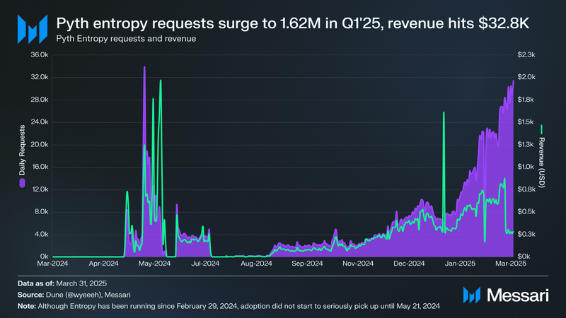 - Pyth Entropy processed over 1 million requests in Q1’25, generating $32.8K in revenue, a 140% increase from the prior quarter. This marks the fourth consecutive quarter of growth and reflects rising demand for onchain randomness services across DeFi use cases.