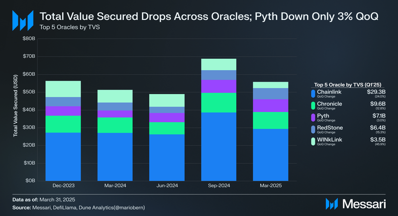 In TVS, Pyth also demonstrated relative resilience. While TVS declined slightly by 3.0%, to $7.15 billion, it marked the smallest drop among top oracles and an increase in market share from 10.7% to 12.8%. In contrast, Chainlink led in absolute value with $29.3 billion, but posted a 24.0% decline. Chronicle fell by 12.8% to $9.6 billion, and WINkLink saw the largest decrease, down 45.9% to $3.5 billion. RedStone was the only major oracle to post positive TVS growth, rising 15.3% to $6.3 billion.