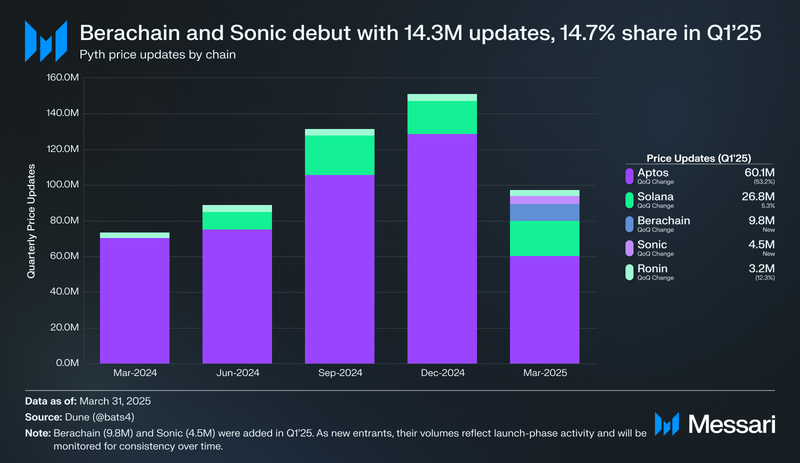 Berachain and Sonic were newly added to the Pyth network this quarter, posting 9.8 million and 4.5 million updates, respectively. These debuts translated to 10.1% and 4.6% market shares, driven by launch-phase activity and early integrations. Given their negligible baselines in prior quarters, growth rates appear outsized; more meaningful trend assessments will be possible as these chains mature and stabilize.