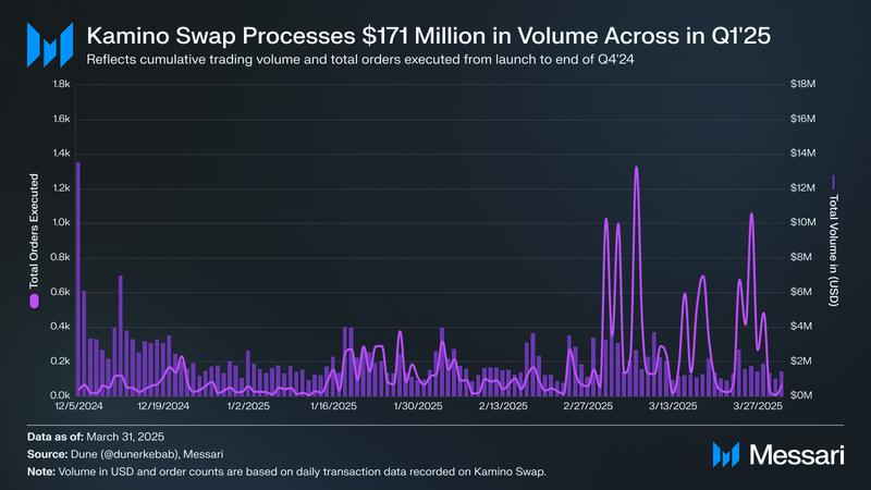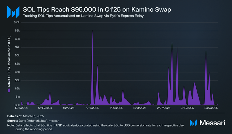 In Q1’25, Kamino Swap processed $171 million in limit order volume, up 824% QoQ from $18.5 million in Q4. A total of 16,787 orders were executed, nearly unchanged from the 16,982 orders in Q4, while 590 SOL (approximately $95,000) in searcher tips were paid to users, reflecting an 855% increase QoQ from $9,951.
