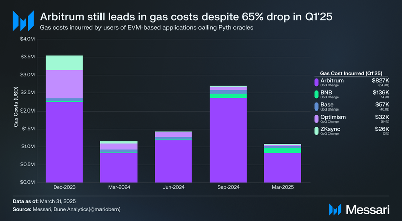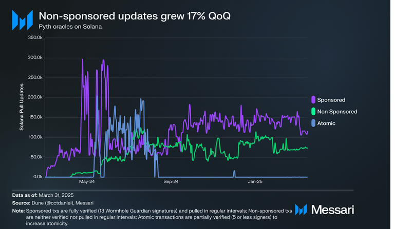 In Q4’24, sponsored updates became the dominant transaction type on Solana, reflecting a growing preference for automated price refresh mechanisms. That trend largely persisted into Q1’25, although with notable shifts across update categories. Sponsored updates remained the largest category, totaling 12.52 million transactions in Q1’25. This represented a 1.0% increase from 12.38 million in Q4’24. These updates are powered by the Pyth Scheduler, a permissionless offchain service that regularly submits verified prices using Wormhole Guardian signatures. Their continued dominance suggests growing adoption of scheduled oracle updates across Solana-based applications.