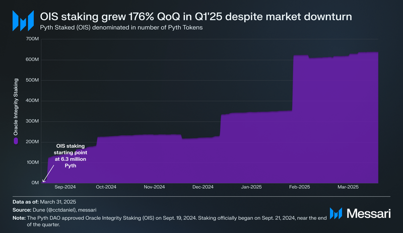 In Q1’25, total PYTH staked in Oracle Integrity Staking (OIS) rose 176.4% QoQ, increasing from 230.9 million PYTH at the end of Q4’24 to 638.7 million PYTH by the close of the quarter. This substantial growth occurred despite broader market downturns and a general decline in DeFi activity, reflecting strong confidence in Pyth’s staking model. The sharp increase highlights continued adoption of OIS as participants increasingly commit capital to support data accuracy while earning protocol-aligned rewards.