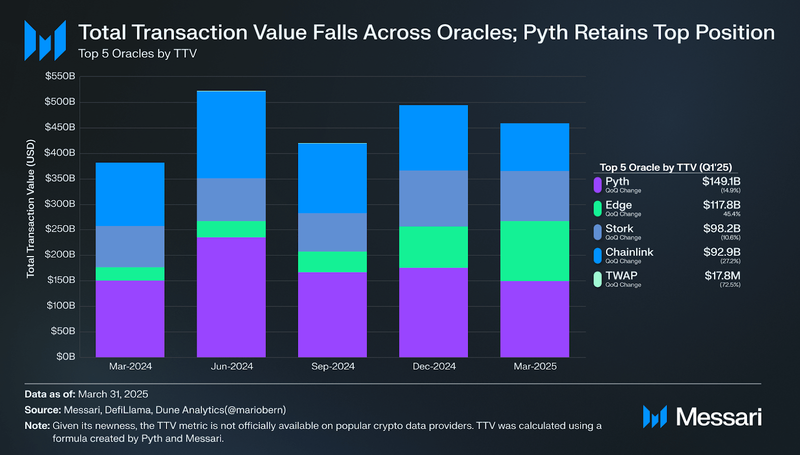 In Q1’25, Pyth maintained its lead in TTV, recording $149.1 billion, a 14.9% decline from $175.2 billion in Q4’24. Its market share dropped to 32.5%, down from 35.5%. Despite the pullback, Pyth retained the top position and outperformed Chainlink, which saw a larger 27.2% drop, falling from $127.6 billion to $92.9 billion, with market share declining from 25.8% to 20.3%. Edge climbed to second place with $117.8 billion, a 45.4% increase, while Stork fell to third with a 10.6% decrease to $98.4 billion. TWAP reported the steepest decline, down 72.5% to $17.8 million.